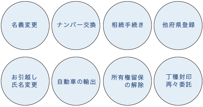 自動車の売買や譲渡による名義変更、ローン・クレジットの完済による名義変更、相続による名義変更によるお手続きをサポートいたします。